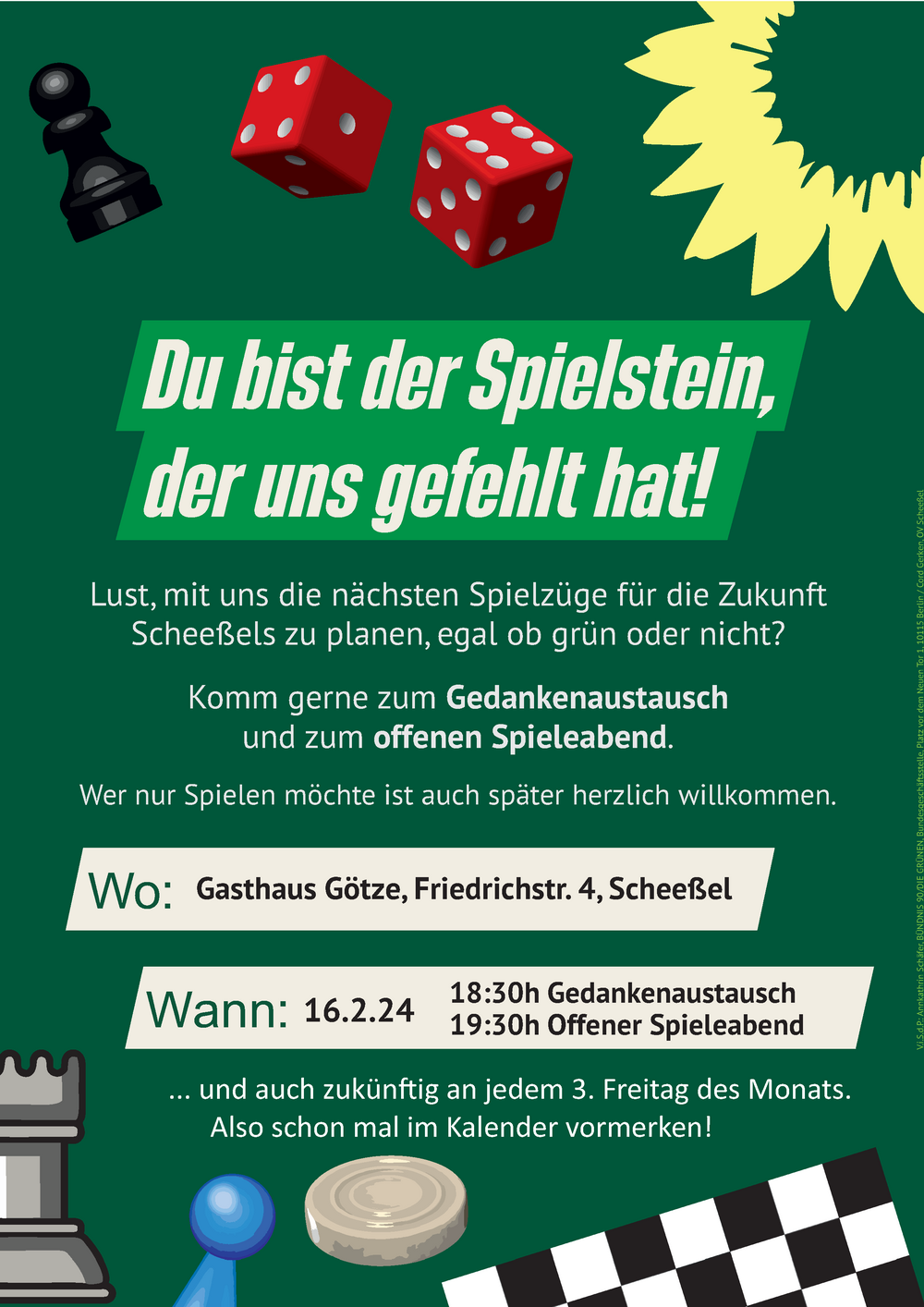 Wir beginnen um 18:30 Uhr mit einem grünen Gedankenaustausch und gehen dann nach ca. einer Stunde in einen offenen Spieleabend über.