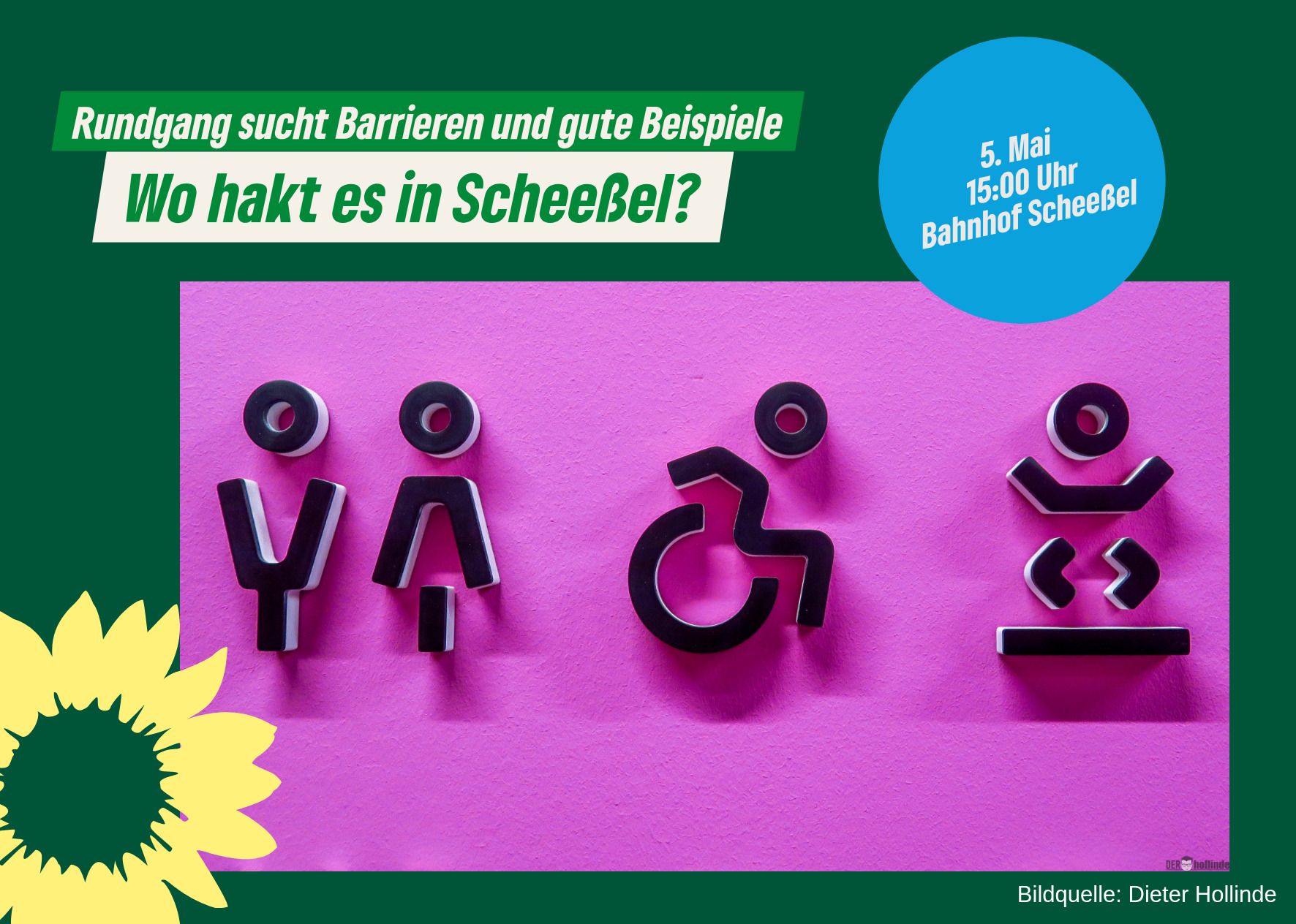 Scheeßel – Zu einem Rundgang durch Scheeßel lädt der Ortsverband Scheeßel von Bündnis 90/Die Grünen am Dienstag, 5. Mai 2026, um 15 Uhr ein. Erster Treffpunkt ist der Bahnhof Scheeßel. Ziel der Veranstaltung ist es, gemeinsam Orte im öffentlichen Raum zu identifizieren, die für Menschen mit eingeschränkter Mobilität problematisch sind – aber auch Beispiele gelungener Barrierefreiheit in den Blick zu nehmen.